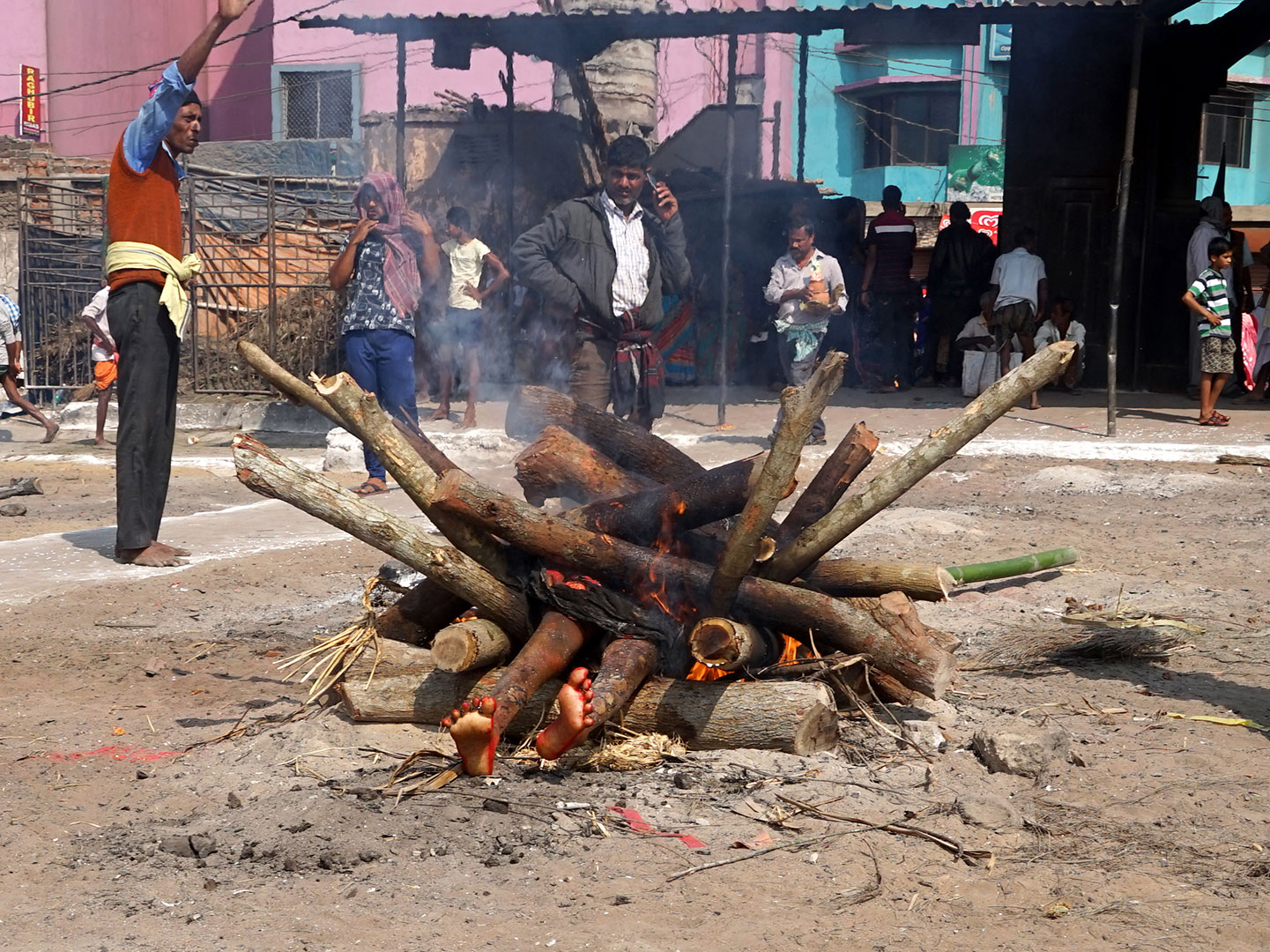 Tijdens een wandeling door de havenstad Visakhapatnam zien we een lijkverbranding. De benen steken nog uit het vuur
