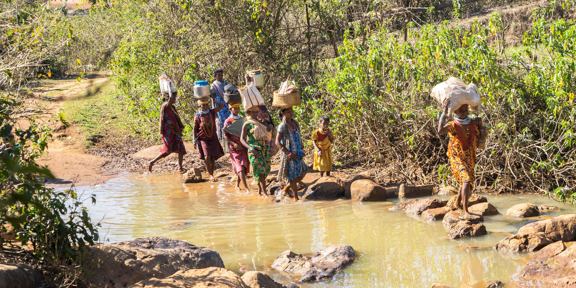 Wij bezoeken de Bonda stam in Odisha, vrouwen komen terug van de markt